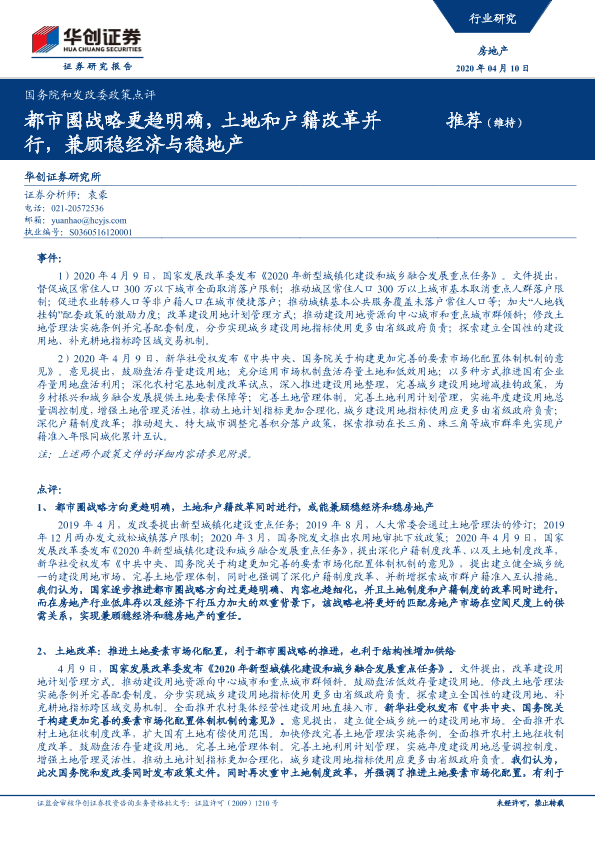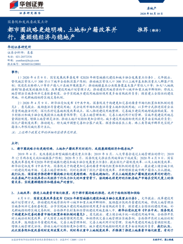 【华创证券】【20200410】国务院和发改委政策点评-都市圈战略更趋明确,土地和户籍改革并行,兼顾稳经济与稳地产-24页