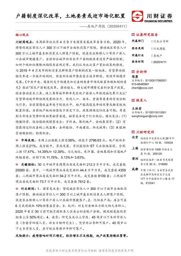 【川财证券】【20200411】房地产周报:户籍制度深化改革,土地要素或迎市场化配置-11页