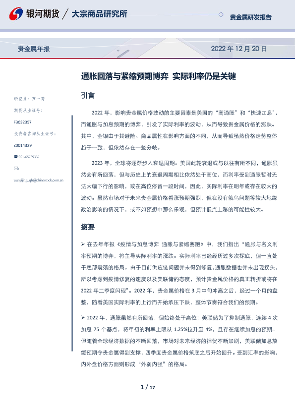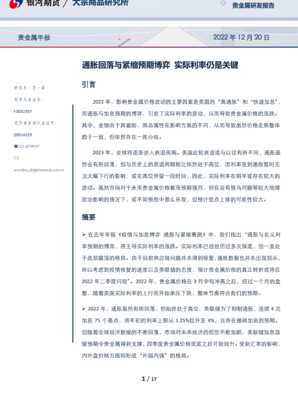 【银河期货】【20221220】贵金属年报:通胀回落与紧缩预期博弈,实际利率仍是关键-17页