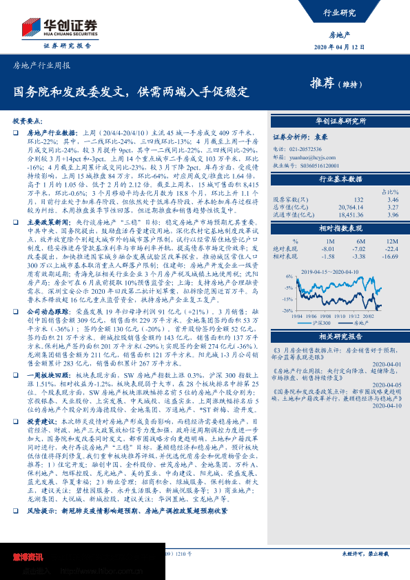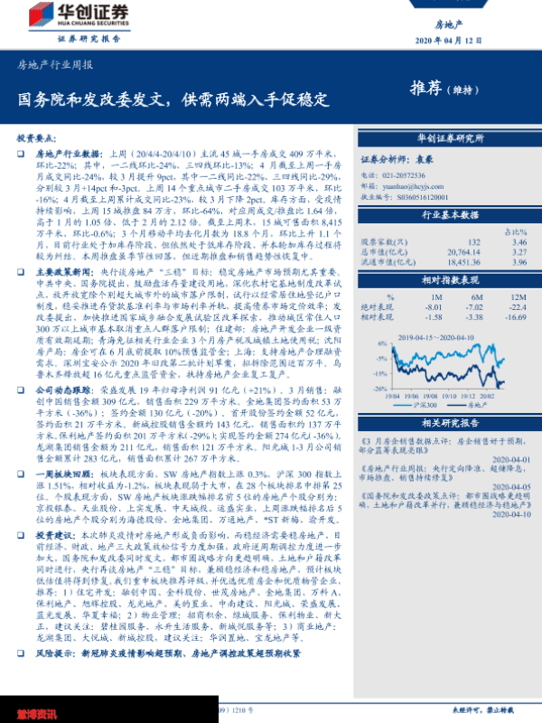 【华创证券】【20200412】房地产行业周报:国务院和发改委发文,供需两端入手促稳定-24页