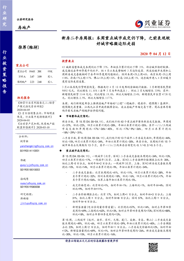 【兴业证券】【20200412】新房二手房周报:本周重点城市成交仍下降,之前表现较好城市略微边际走弱-16页
