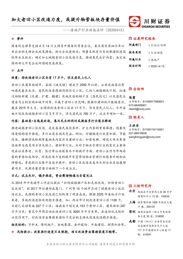 【川财证券】【20200415】加大老旧小区改造力度,或提升物管板块存量价值-2页