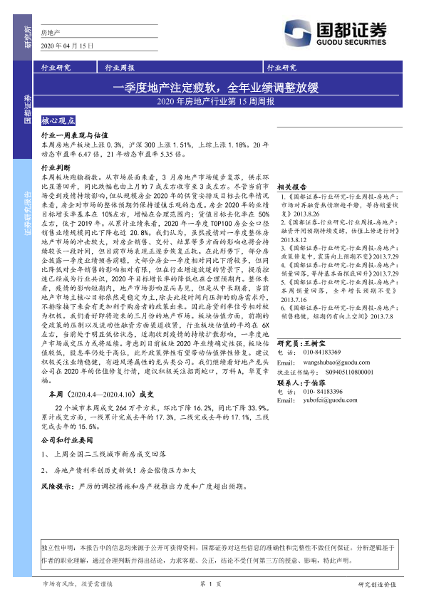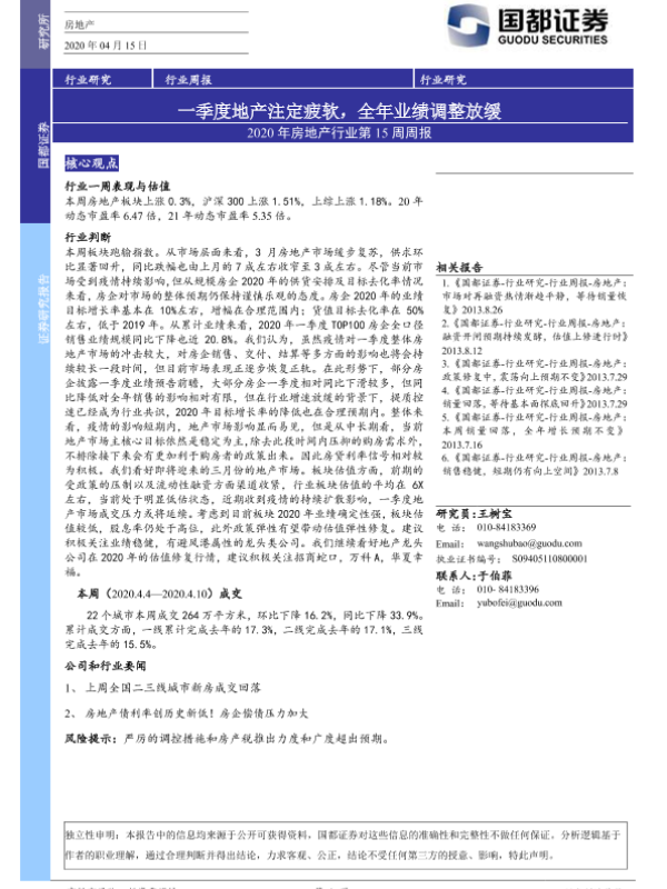 【国都证券】【20200415】2020年房地产行业第15周周报:一季度地产注定疲软,全年业绩调整放缓-9页