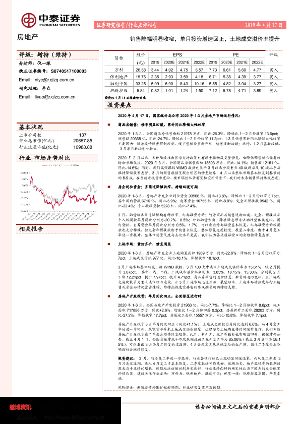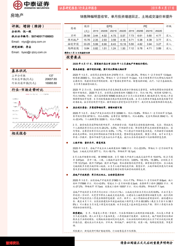 【中泰证券】【20200417】房地产行业点评报告:销售降幅明显收窄,单月投资增速回正,土地成交溢价率提升-2页