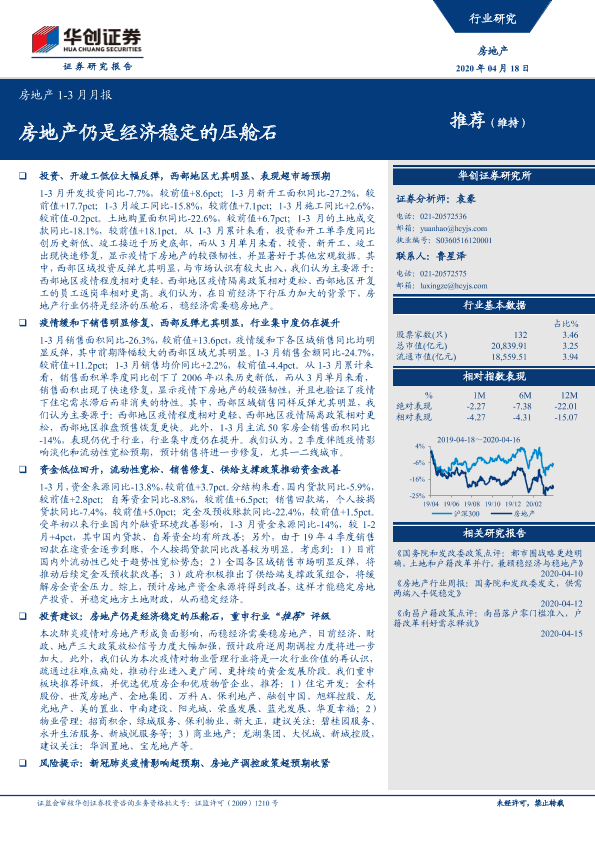 【华创证券】【20200418】房地产1-3月月报:房地产仍是经济稳定的压舱石-12页