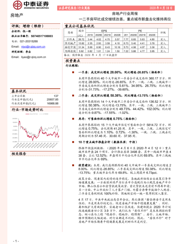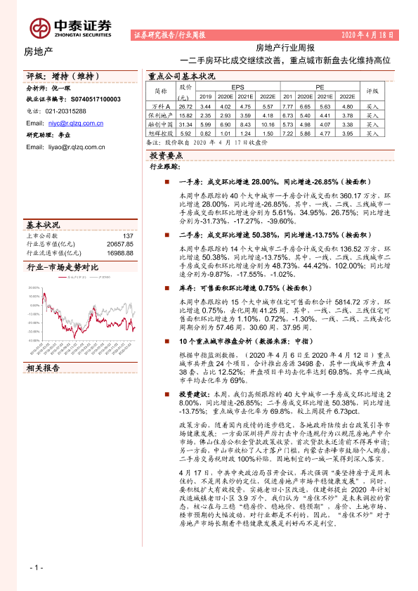 【中泰证券】【20200418】房地产行业周报:一二手房环比成交继续改善,重点城市新盘去化维持高位-21页