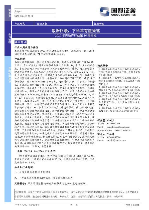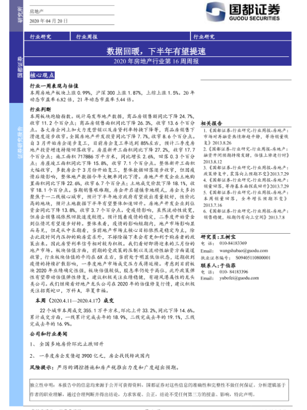 【国都证券】【20200420】2020年房地产行业第16周周报:数据回暖,下半年有望提速-9页