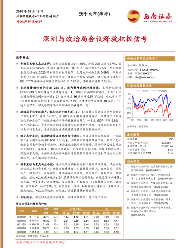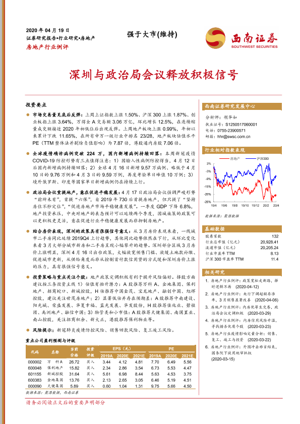 【西南证券】【20200419】房地产行业例评:深圳与政治局会议释放积极信号-25页