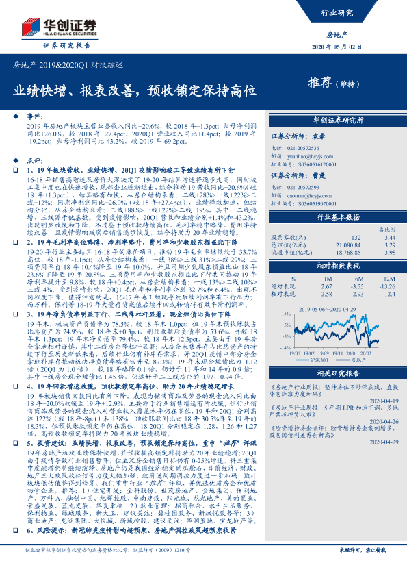 【华创证券】【20200502】房地产2019&2020Q1财报综述:业绩快增、报表改善,预收锁定保持高位-22页