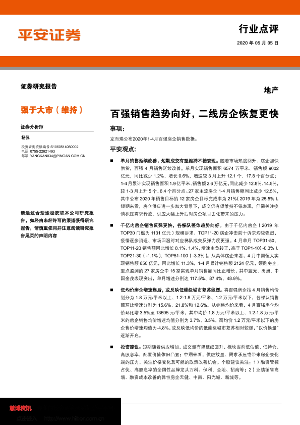 【平安证券】【20200505】地产:百强销售趋势向好,二线房企恢复更快-5页