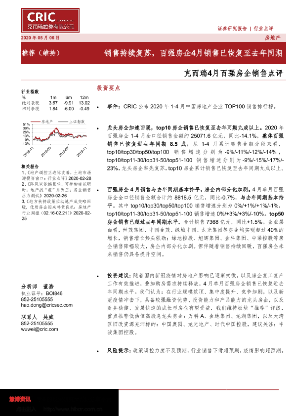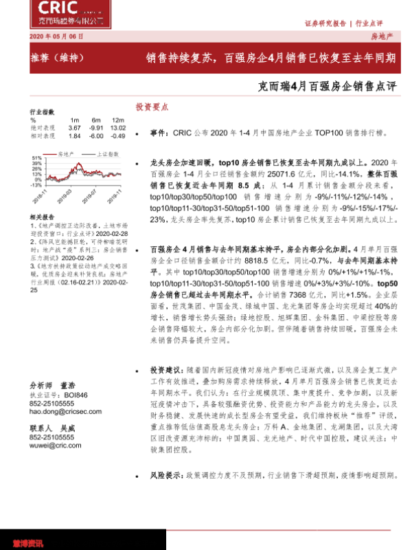 【克而瑞证券】【20200506】4月百强房企销售点评:销售持续复苏-4页