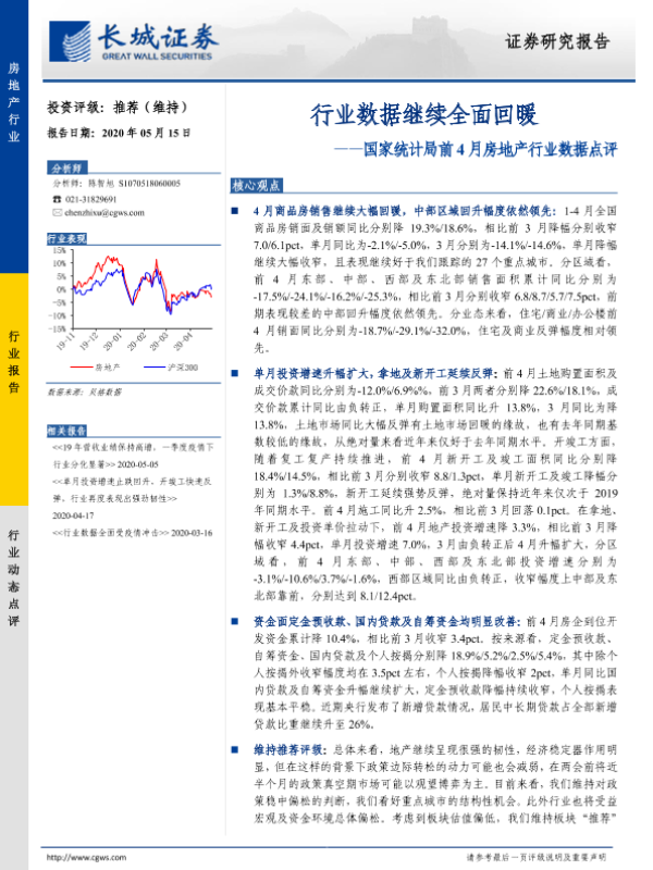 【长城证券】【20200515】国家统计局前4月房地产行业数据点评:行业数据继续全面回暖-9页