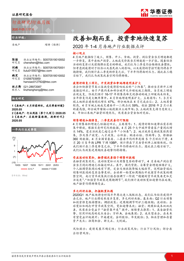 【华泰证券】【20200517】2020年1-4月房地产行业数据点评:改善如期而至,投资拿地快速复苏-11页