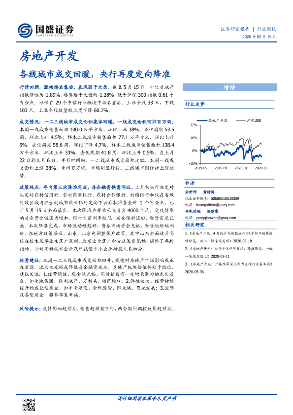 【国盛证券】【20200519】房地产开发行业周报:各线城市成交回暖,央行再度定向降准-12页