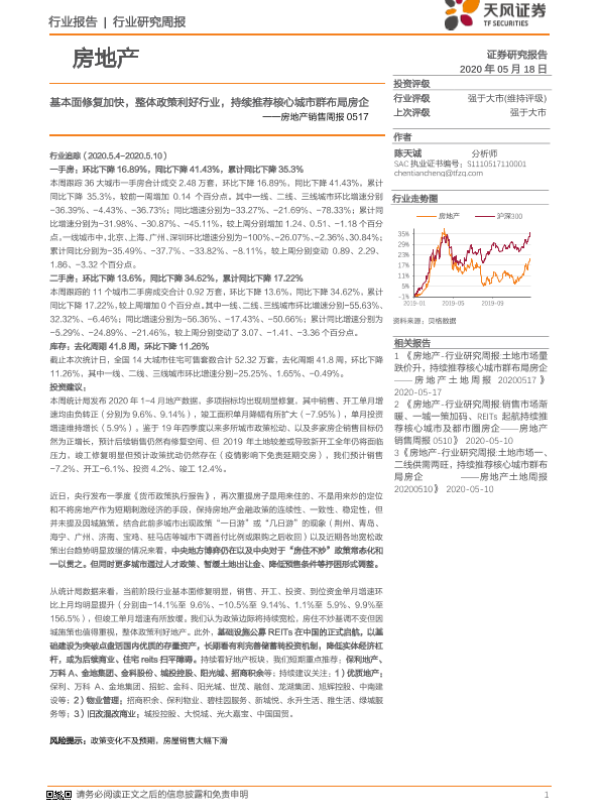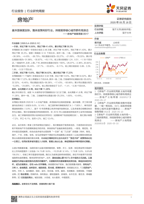 【天风证券】【20200518】房地产销售周报:基本面修复加快,整体政策利好行业,持续推荐核心城市群布局房企-12页