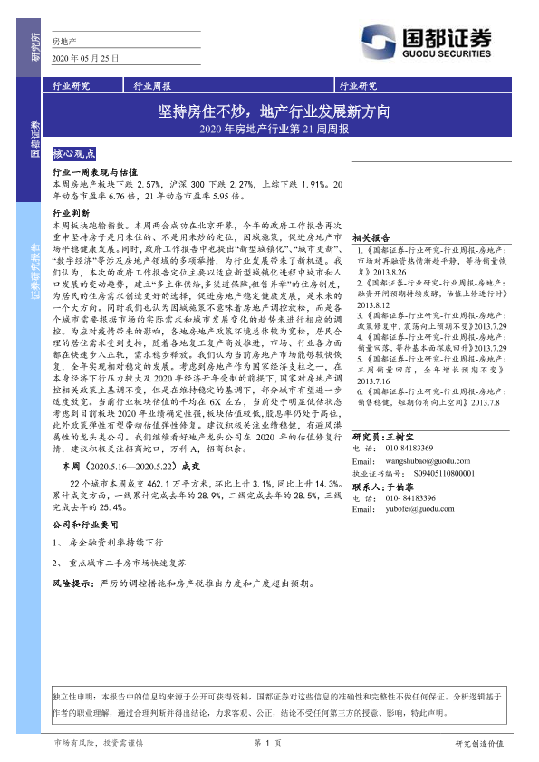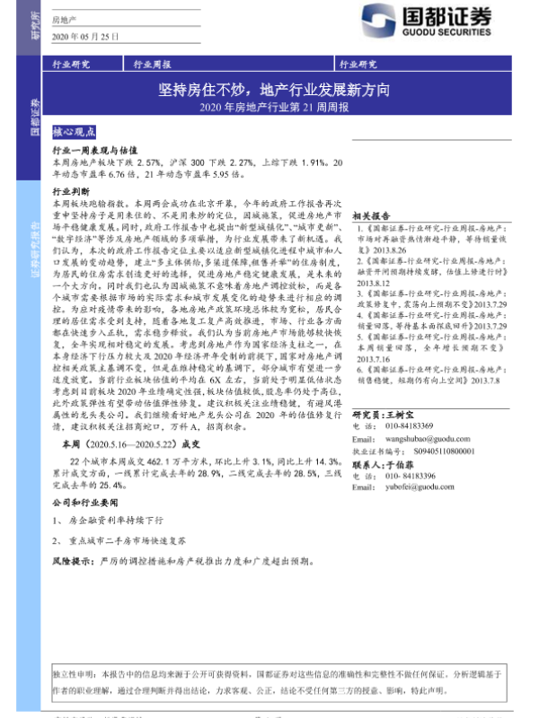 【国都证券】【20200525】2020年房地产行业第21周周报:坚持房住不炒,地产行业发展新方向-9页