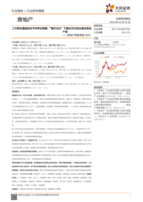 【天风证券】【20200525】工作报告重提房住不炒符合预期、“稳字当头”下建议关注低估值优质地产股-12页