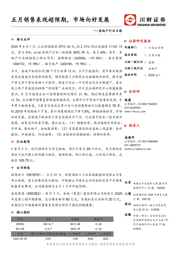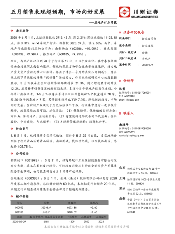 【川财证券】【20200601】房地产行业日报:五月销售表现超预期,市场向好发展-3页