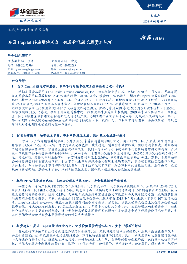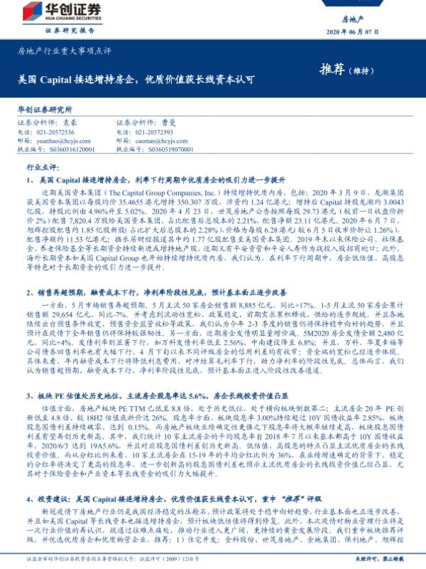 【华创证券】【20200607】美国Capital接连增持房企,优质价值获长线资本认可-7页
