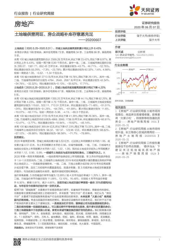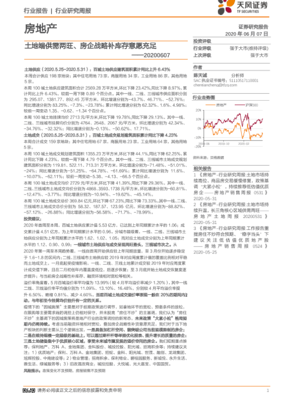 【天风证券】【20200607】土地端供需两旺、房企战略补库存意愿充足-8页