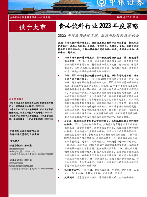 【中银证券】【20221218】食品饮料行业2023年度策略:2023年行业将持续复苏,把握两阶段的投资机会-24页