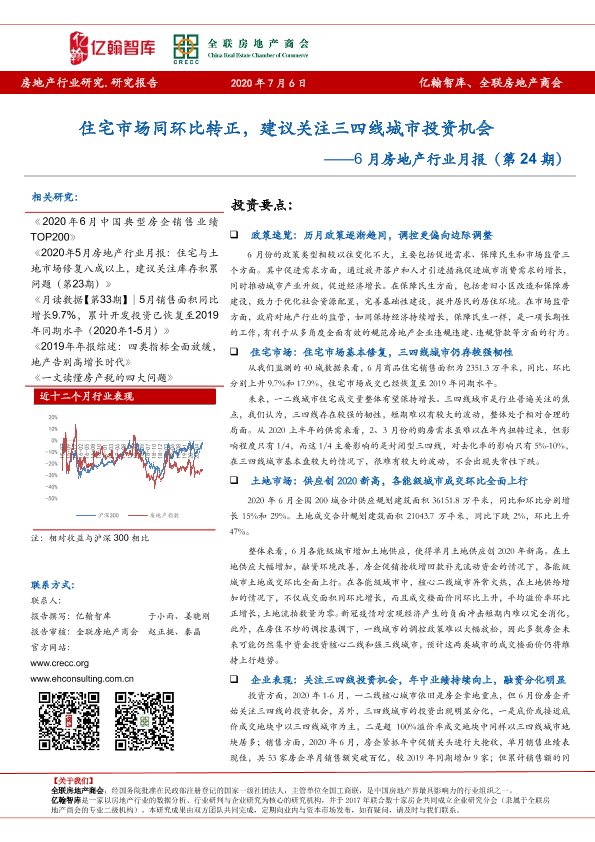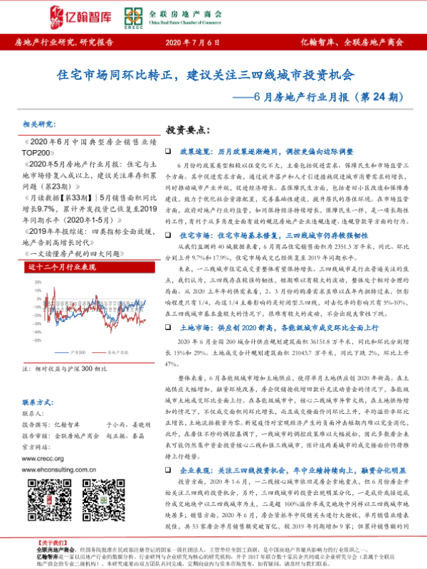 【亿翰智库】【20200706】6月房地产行业月报:住宅市场同环比转正,建议关注三四线城市投资机会-25页