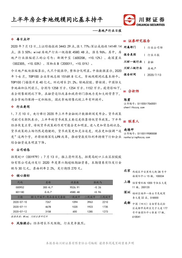 【川财证券】【20200713】上半年房企拿地规模同比基本持平-3页