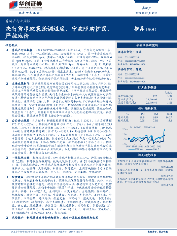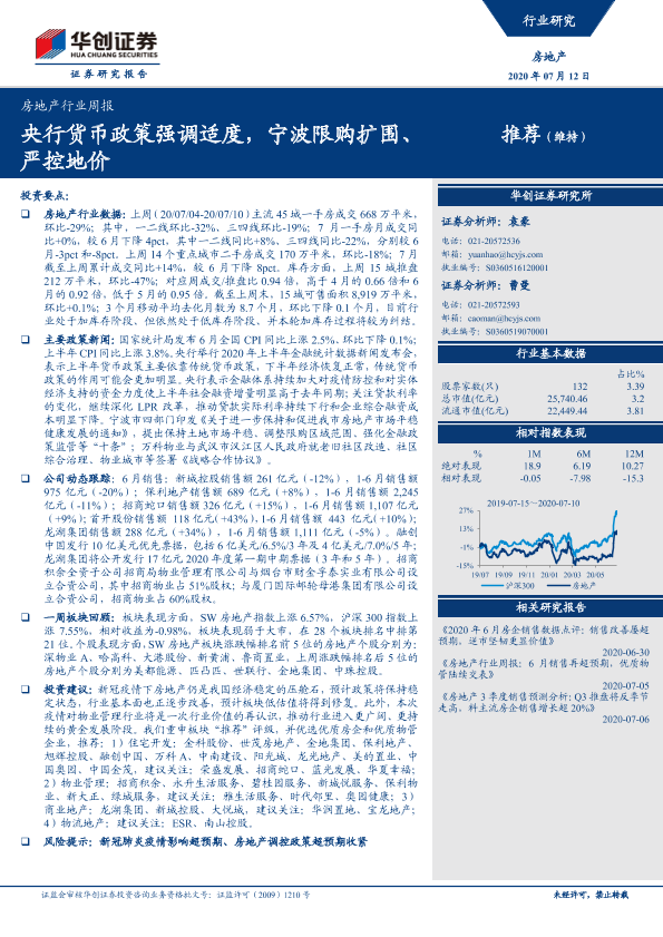 【华创证券】【20200712】房地产行业周报:央行货币政策强调适度,宁波限购扩围、严控地价-25页