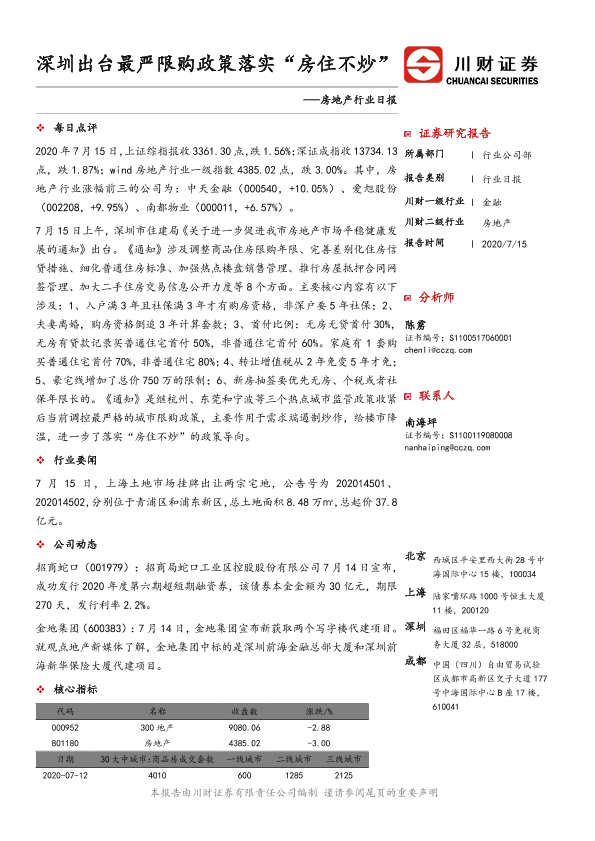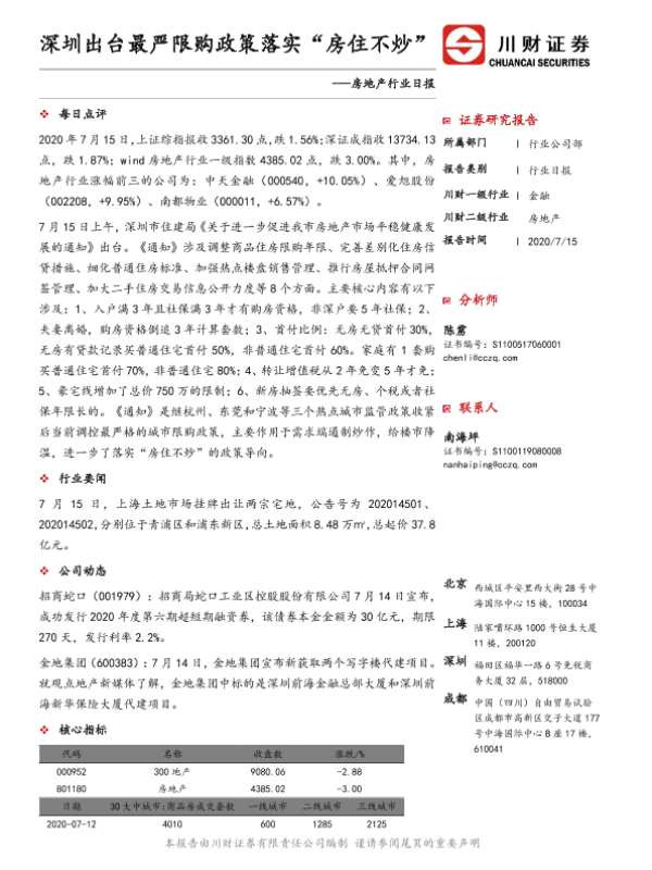 【川财证券】【20200715】深圳出台最严限购政策落实“房住不炒”-3页