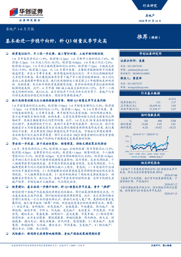【华创证券】【20200716】房地产1-6月月报:基本面进一步稳中向好,料Q3销量反季节走高-12页