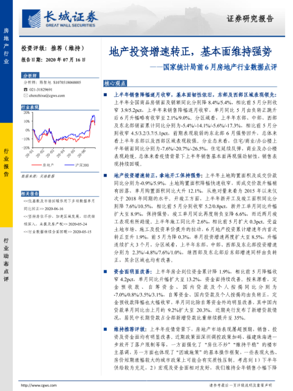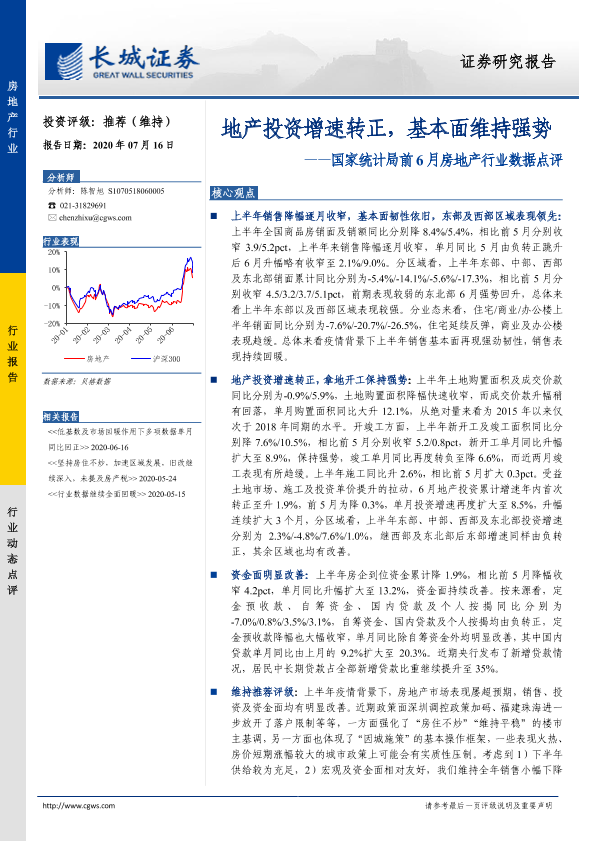 【长城证券】【20200716】国家统计局前6月房地产行业数据点评:地产投资增速转正,基本面维持强势-9页