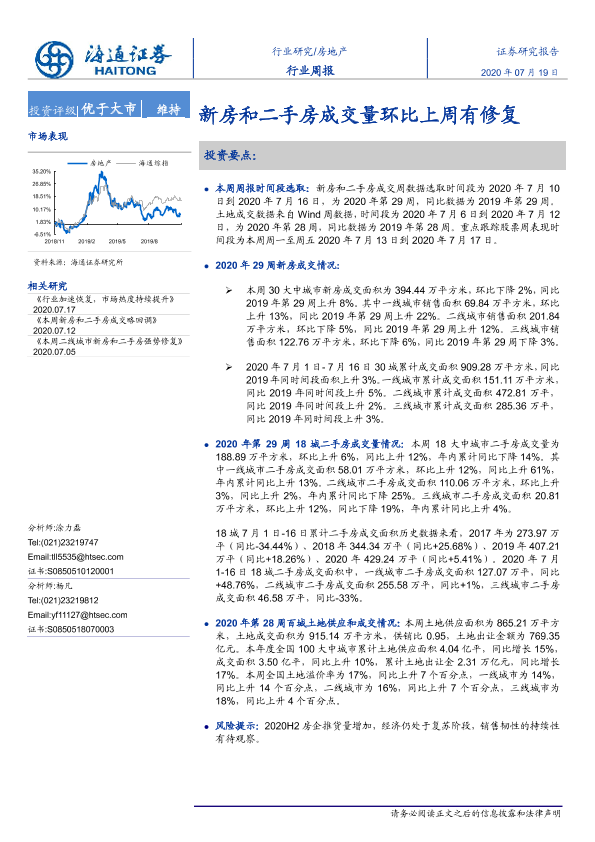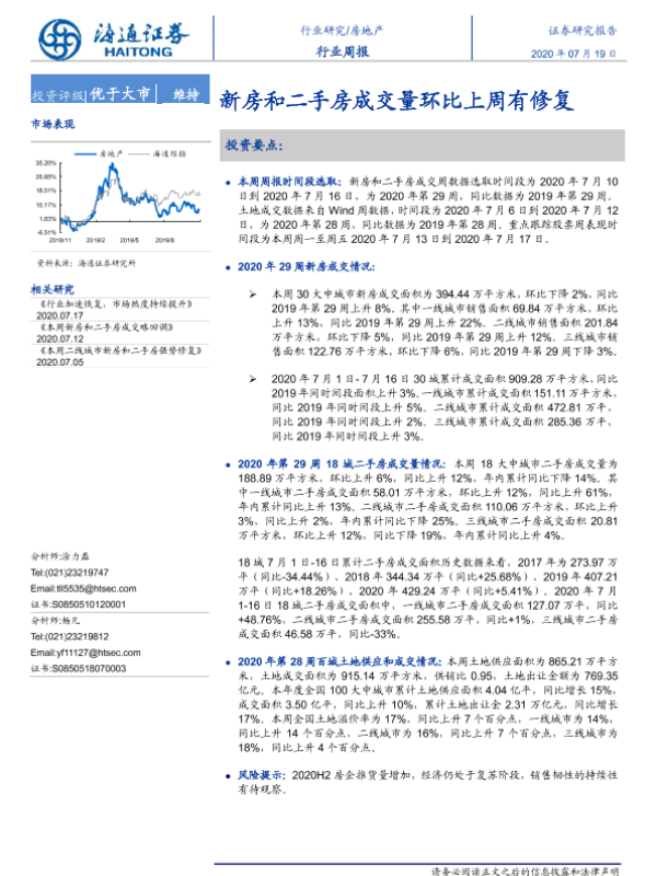 【海通证券】【20200719】房地产行业周报:新房和二手房成交量环比上周有修复-6页