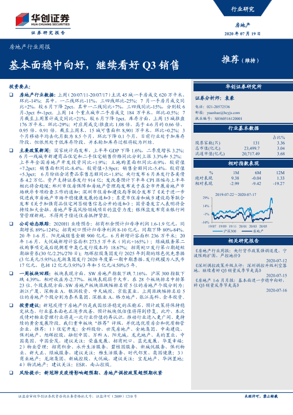 【华创证券】【20200719】房地产行业周报:基本面稳中向好,继续看好Q3销售-24页