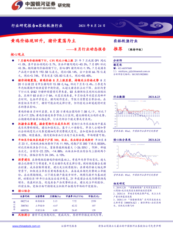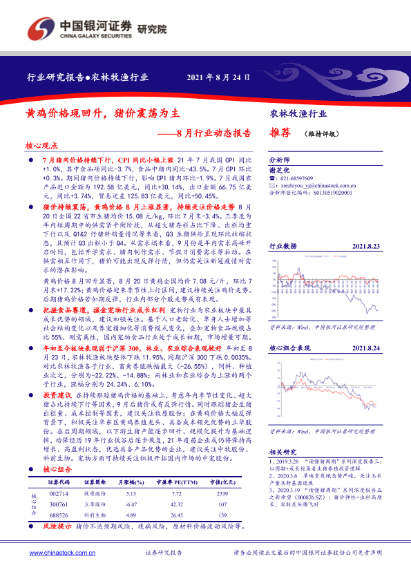 【银河证券】【20210824】农林牧渔行业8月行业动态报告:黄鸡价格现回升,猪价震荡为主-23页
