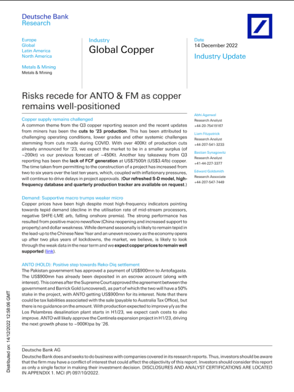 【Deutsche Bank】【20221214】Global Copper Risks recede for ANTO & FM as copper remains well-positioned-11页