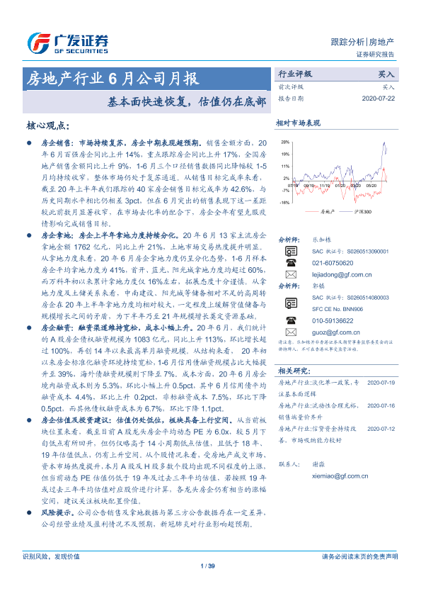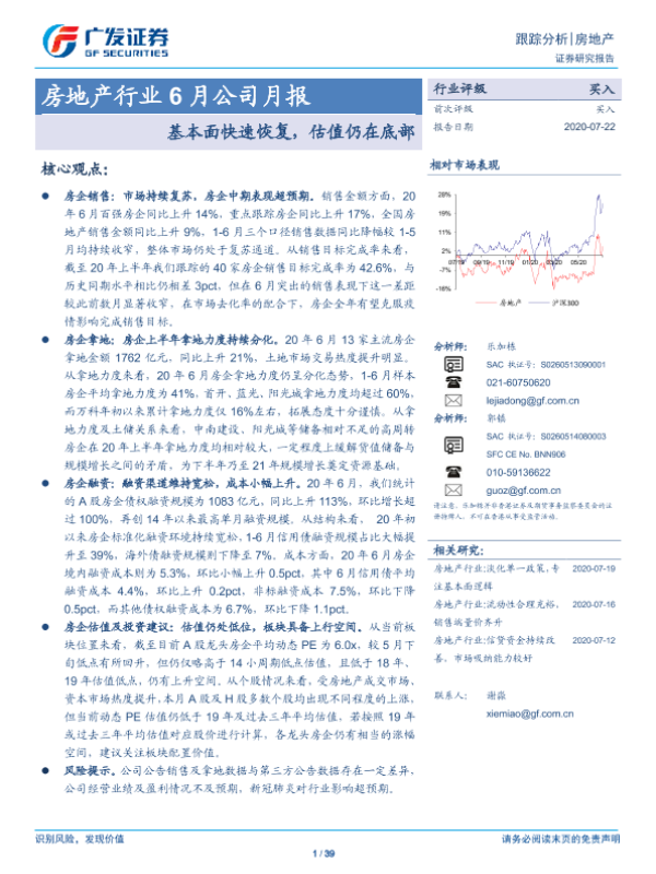 【广发证券】【20200722】房地产行业6月公司月报:基本面快速恢复,估值仍在底部-39页