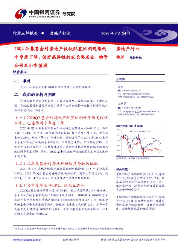 【银河证券】【20200724】20Q2公募基金对房地产板块配置比例连续两个季度下降,偏好高弹性的成长类房企、物管公司及小市值股-8页