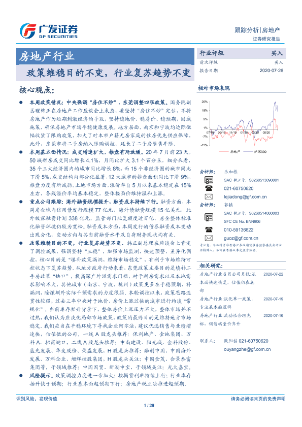 【广发证券】【20200726】房地产行业跟踪分析:政策维稳目的不变,行业复苏趋势不变-26页