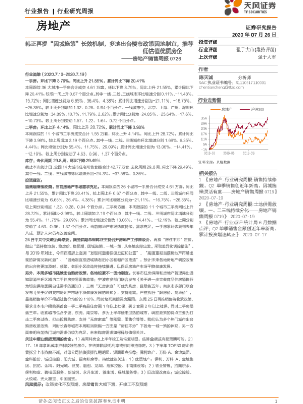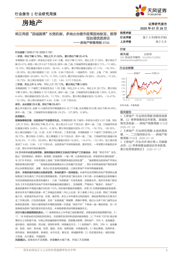 【天风证券】【20200726】天风证券-房地产销售周报:韩正再提“因城施策”长效机制,多地出台楼市政策因地制宜,推荐低估值优质房企-12页