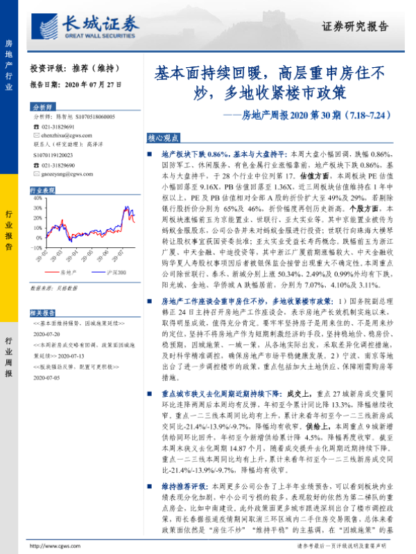 【长城证券】【20200727】房地产周报2020第30期:基本面持续回暖,高层重申房住不炒,多地收紧楼市政策-16页