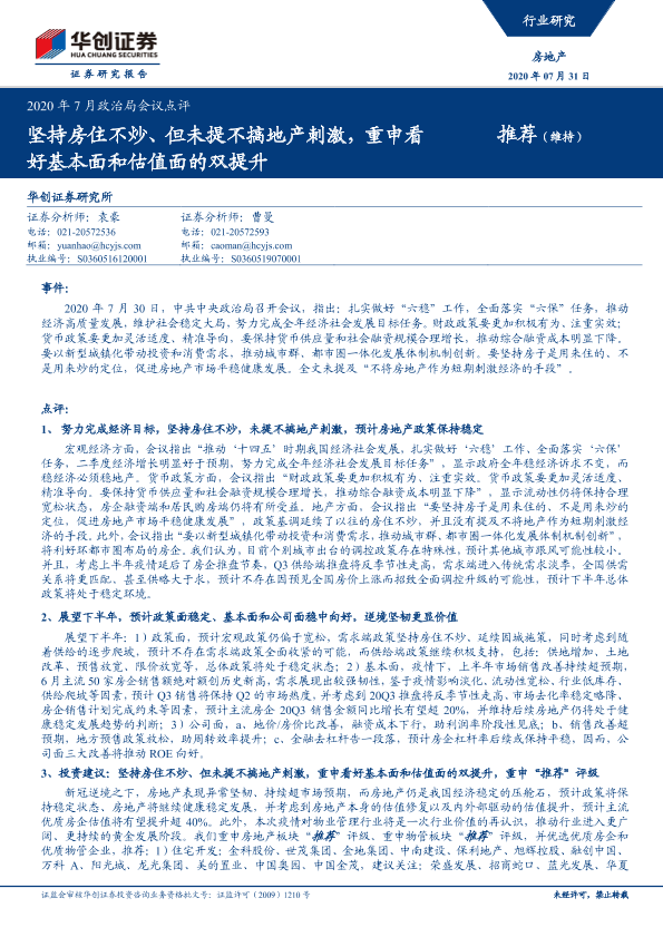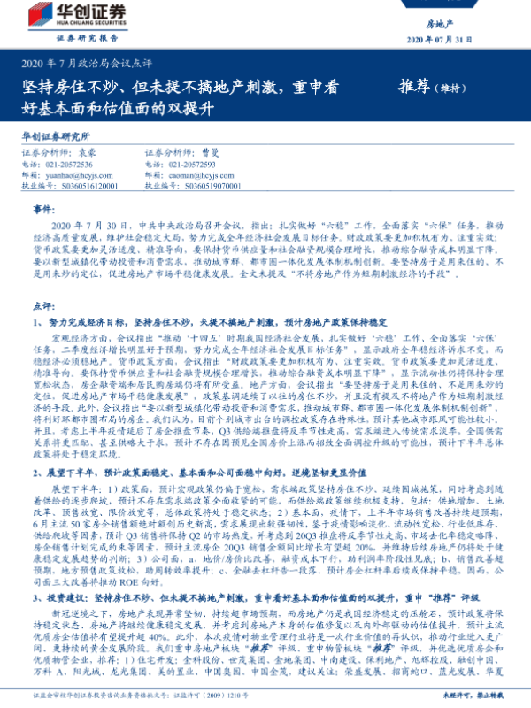 【华创证券】【20200731】2020年7月政治局会议点评:坚持房住不炒、但未提不搞地产刺激,重申看好基本面和估值面的双提升-8页