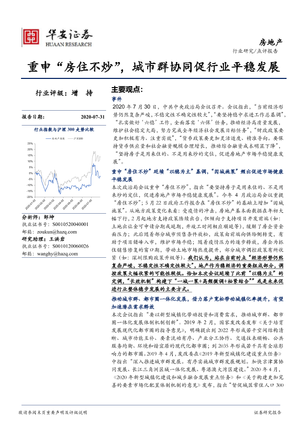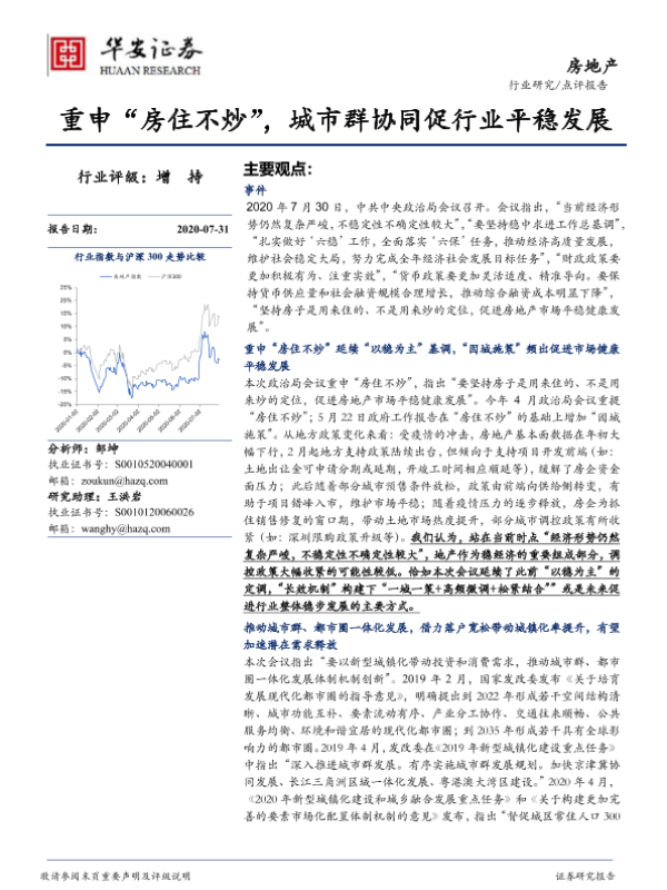【华安证券】【20200731】重申“房住不炒”,城市群协同促行业平稳发展-3页