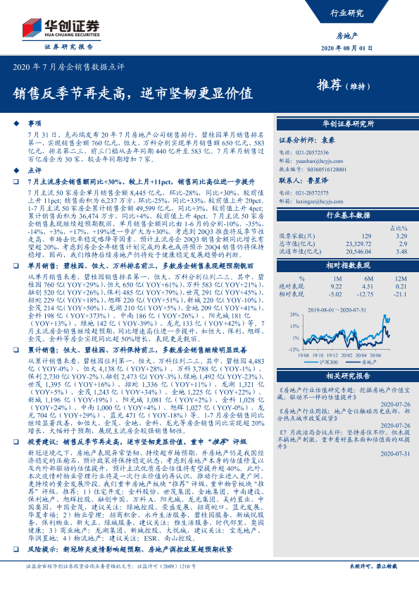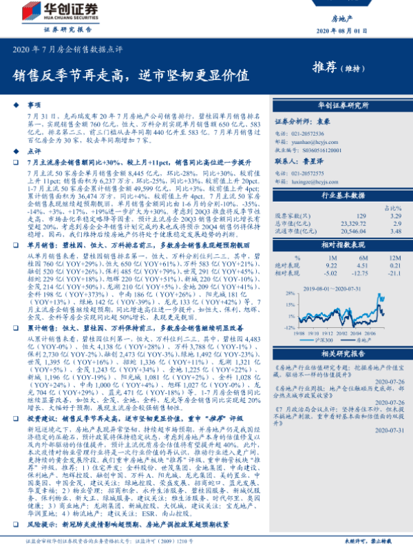 【华创证券】【20200801】2020年7月房企销售数据点评:销售反季节再走高,逆市坚韧更显价值-11页