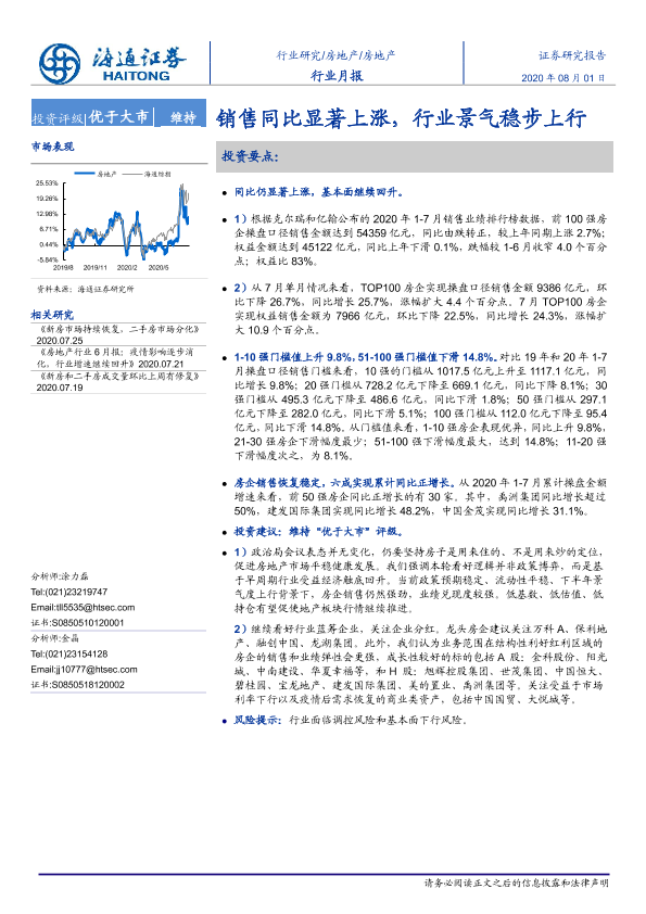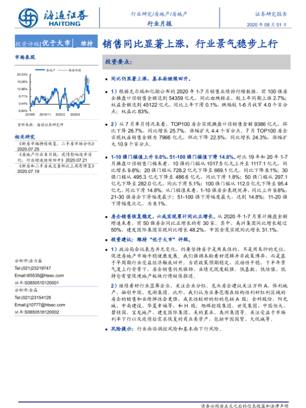 【海通证券】【20200801】房地产行业月报:销售同比显著上涨,行业景气稳步上行-9页