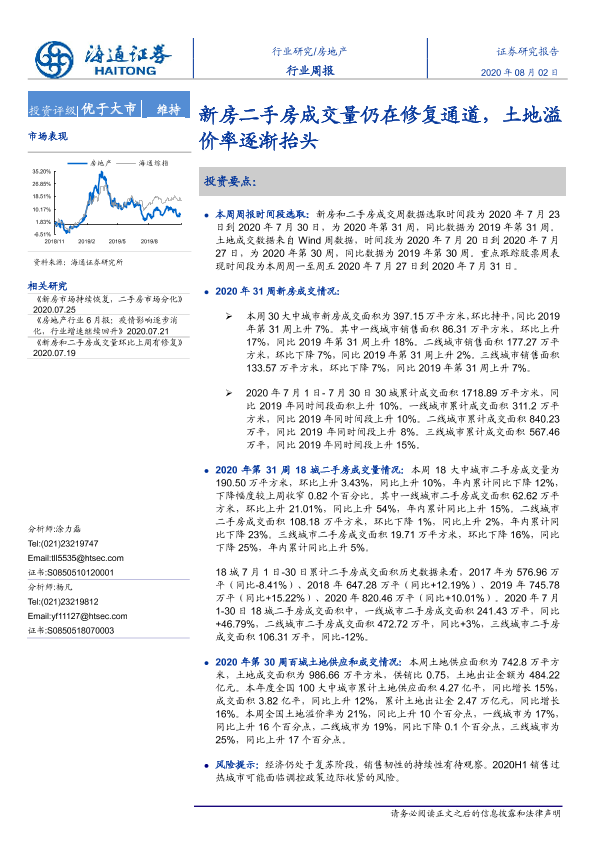 【海通证券】【20200802】房地产行业周报:新房二手房成交量仍在修复通道,土地溢价率逐渐抬头-6页