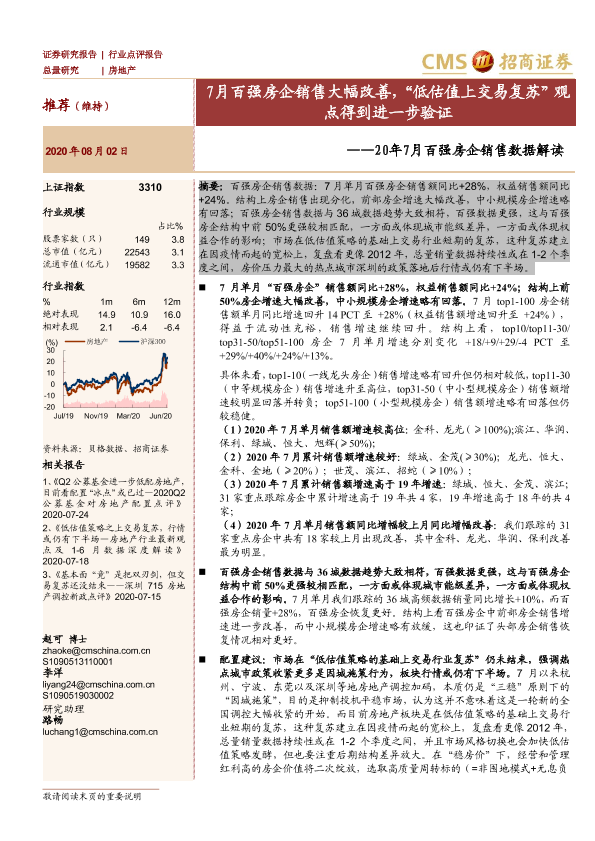 【海通证券】【20200802】20年7月百强房企销售数据解读:7月百强房企销售大幅改善,“低估值上交易复苏”观点得到进一步验证-4页