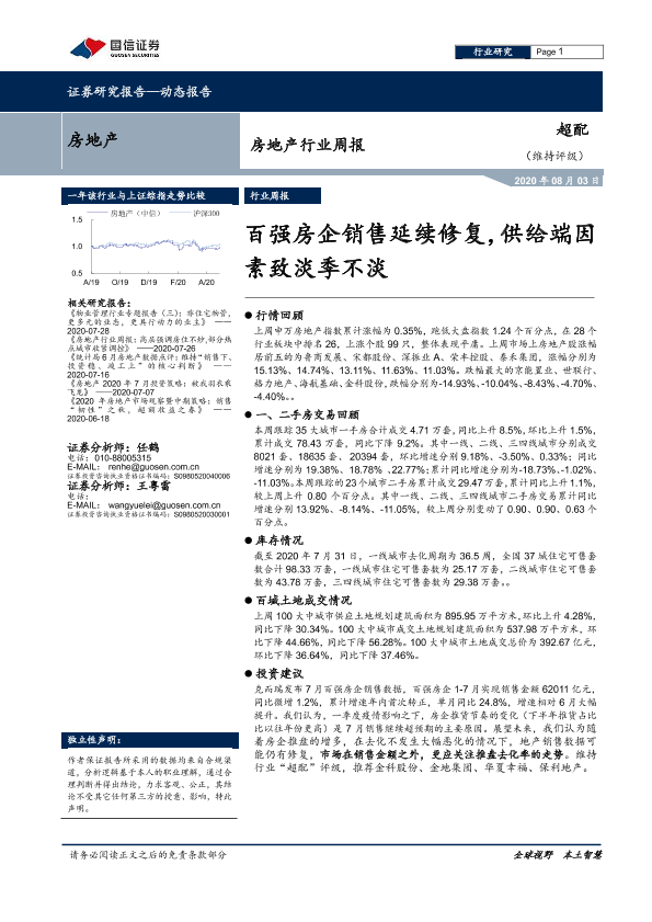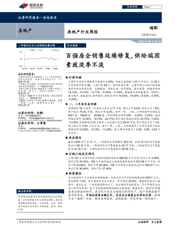 【国信证券】【20200803】房地产行业周报:百强房企销售延续修复,供给端因素致淡季不淡-15页