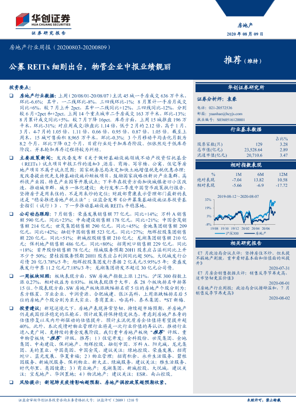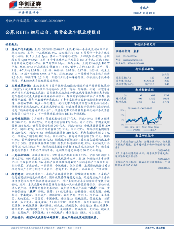 【华创证券】【20200809】房地产行业周报:公募REITs细则出台,物管企业中报业绩靓丽-24页