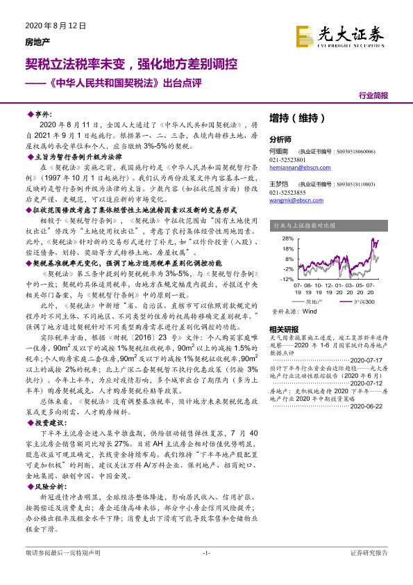 【光大证券】【20200812】《中华人民共和国契税法》出台点评:契税立法税率未变,强化地方差别调控-2页