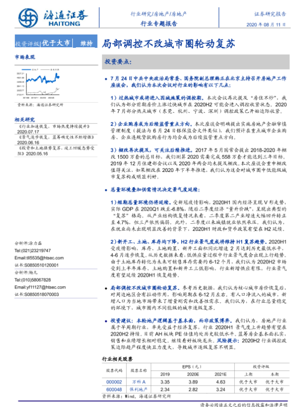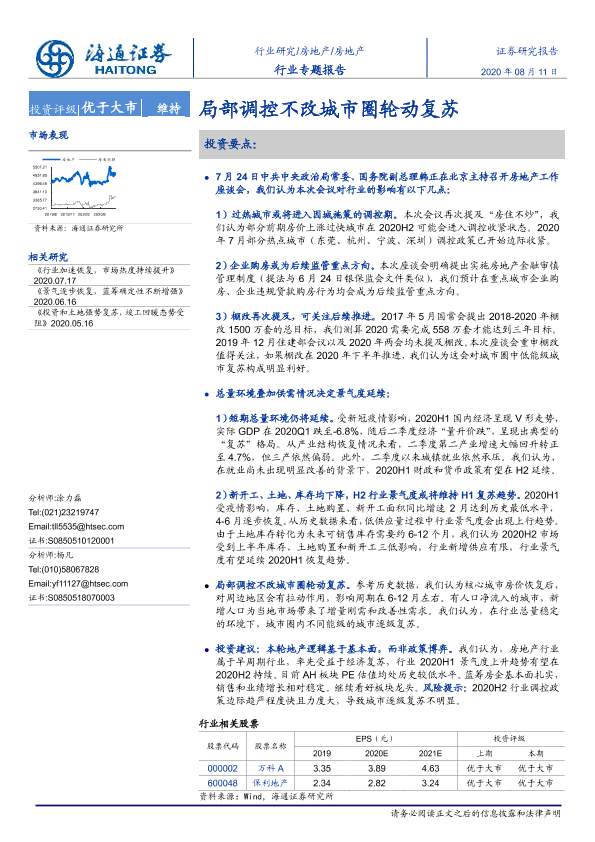 【海通证券】【20200811】房地产行业专题报告:局部调控不改城市圈轮动复苏-11页
